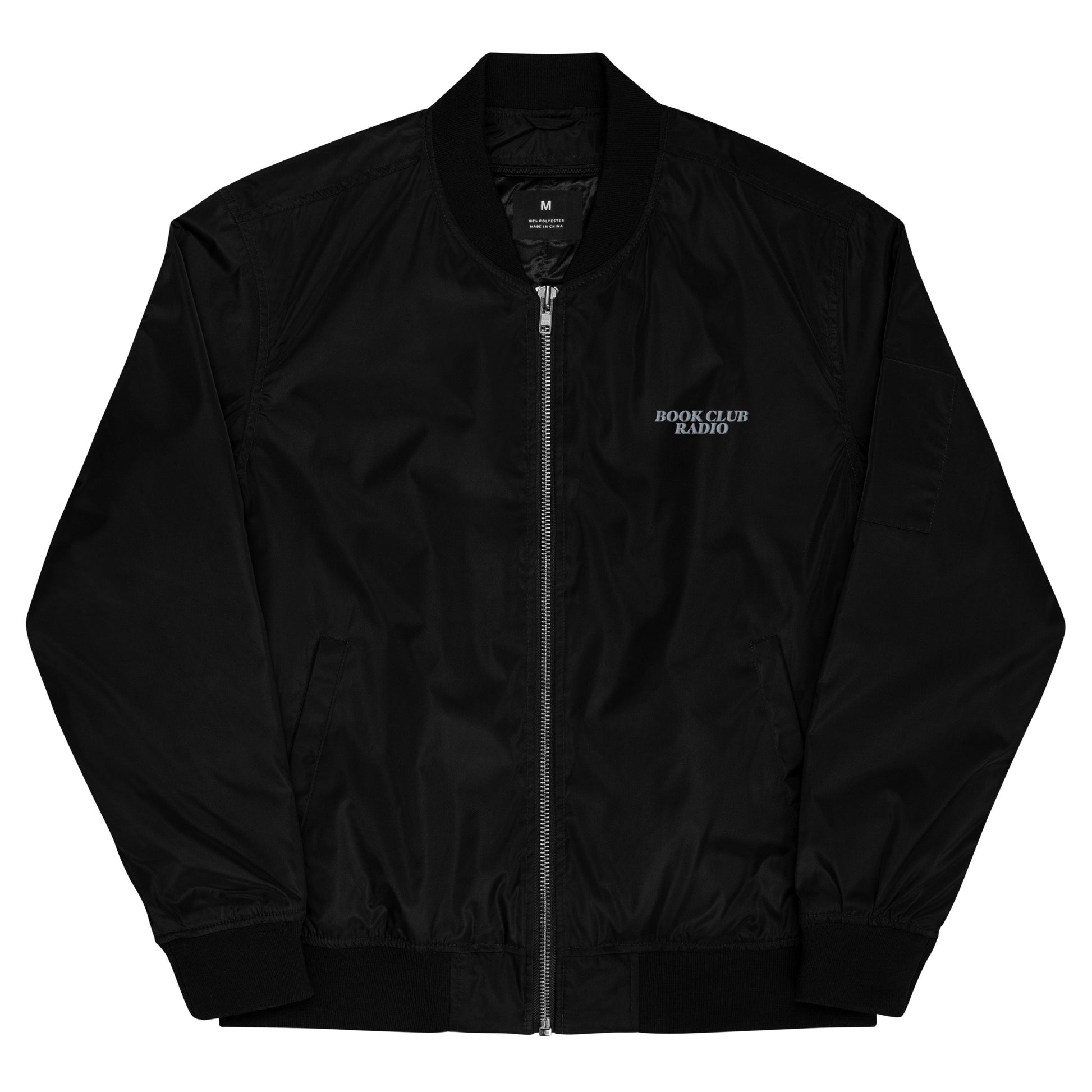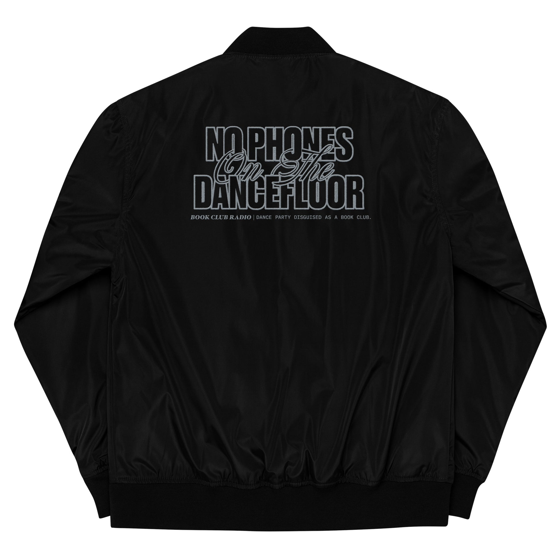 A classic unisex bomber jacket, with the Book Club Radio logo embroidered on the front, and "No Phones on the Dancefloor" embroidered on the back.